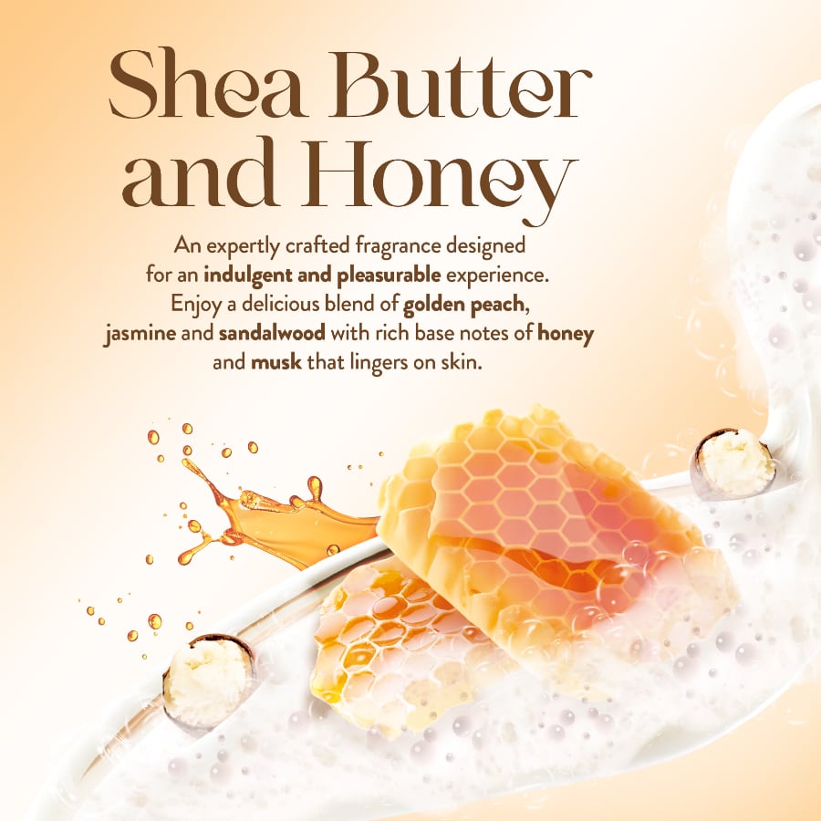 Our Shea Butter & Honey scent is an expertly crafted fragrance designed for an indulgent and pleasurable experience. Enjoy a delicious blend of golden peach, jasmine and sandalwood with rich base notes of honey and musk that lingers on skin.